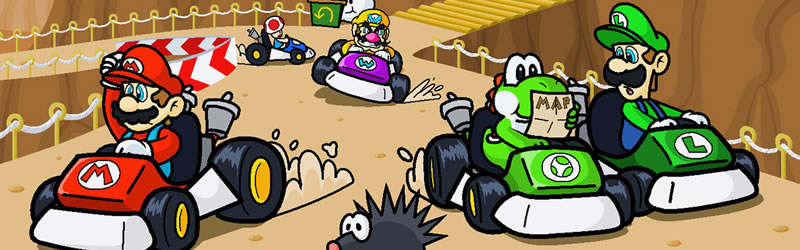 Fanart of Mario, Yoshi, Luigi, Wario and Toad racing through Yoshi Valley in Mario Kart 64.