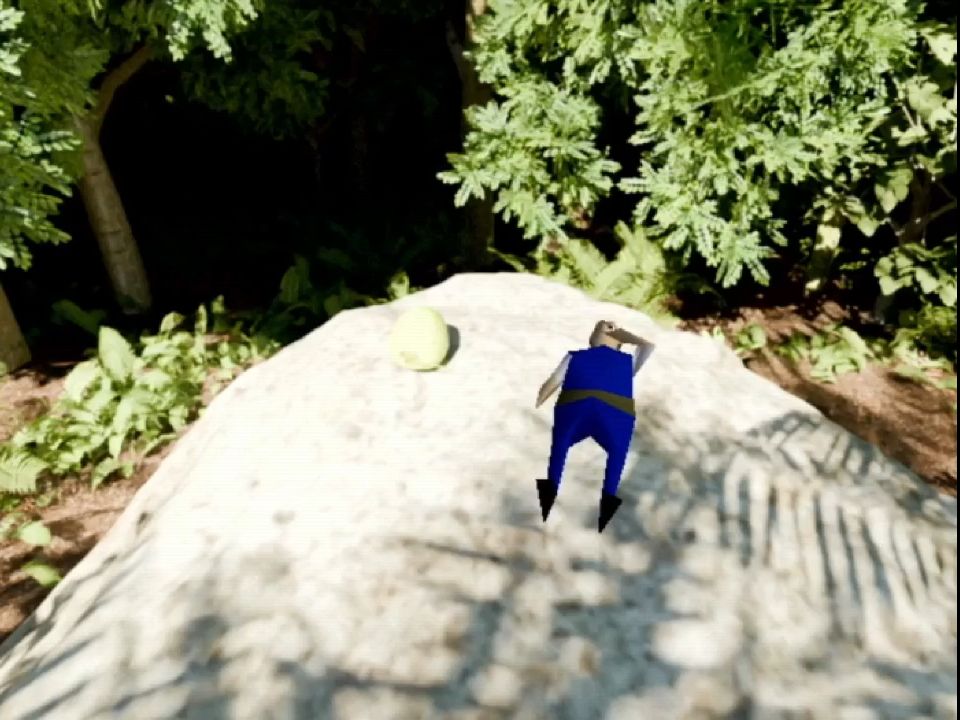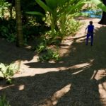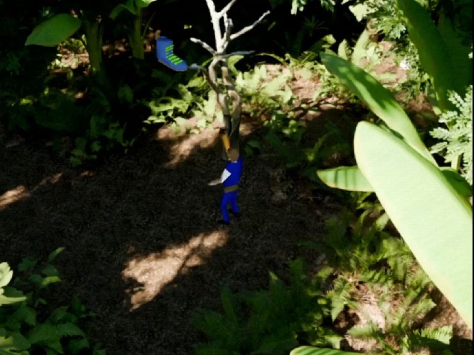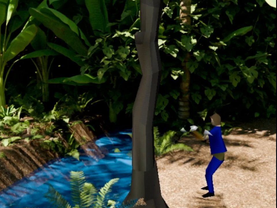 A couple of other minor nitpicks is that there are some times where the z-buffer doesn’t quite work and you end up walking in front of a palm tree that is supposed to be above you. Also sometimes it’s hard to figure out where you can walk, especially in the second level; it took me forever to figure out that there was an area to the left of the juice machine and also the hallway that takes you to the keypad. The hit detection for interactions is also a bit hard to find, especially for the shoe in the tree and the cliff.