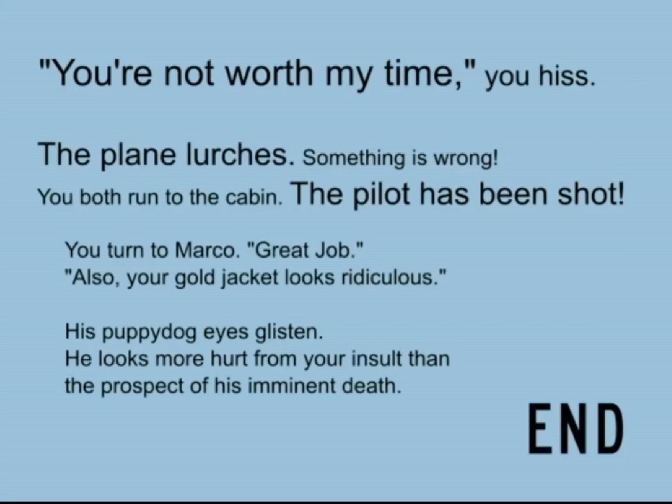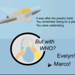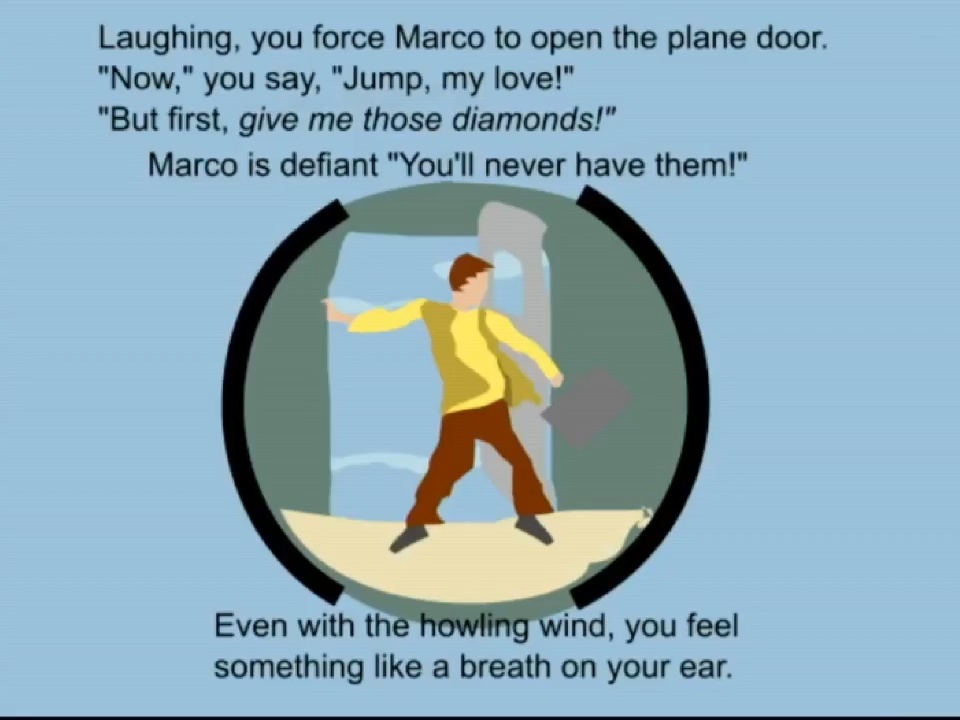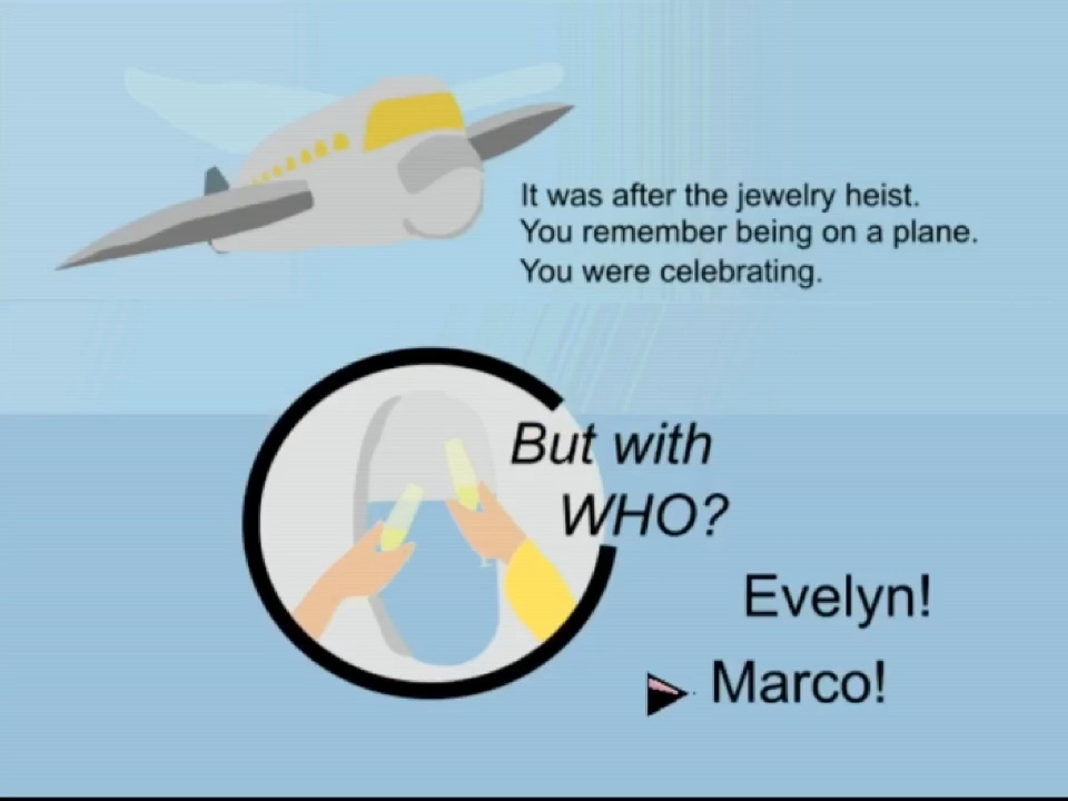 The story starts with you falling down in the sky, but how did it get to this point? This is a choose-your-own-adventure kind of game so the story starts in a flashback on a plane after a jewel heist. You’re there with your two fellow criminals, Marco and Evelyn. You start off by remembering who it is you were celebrating with, and everything descends into chaos from there.