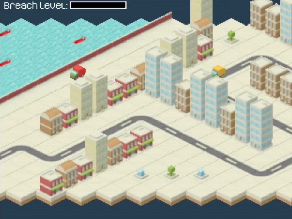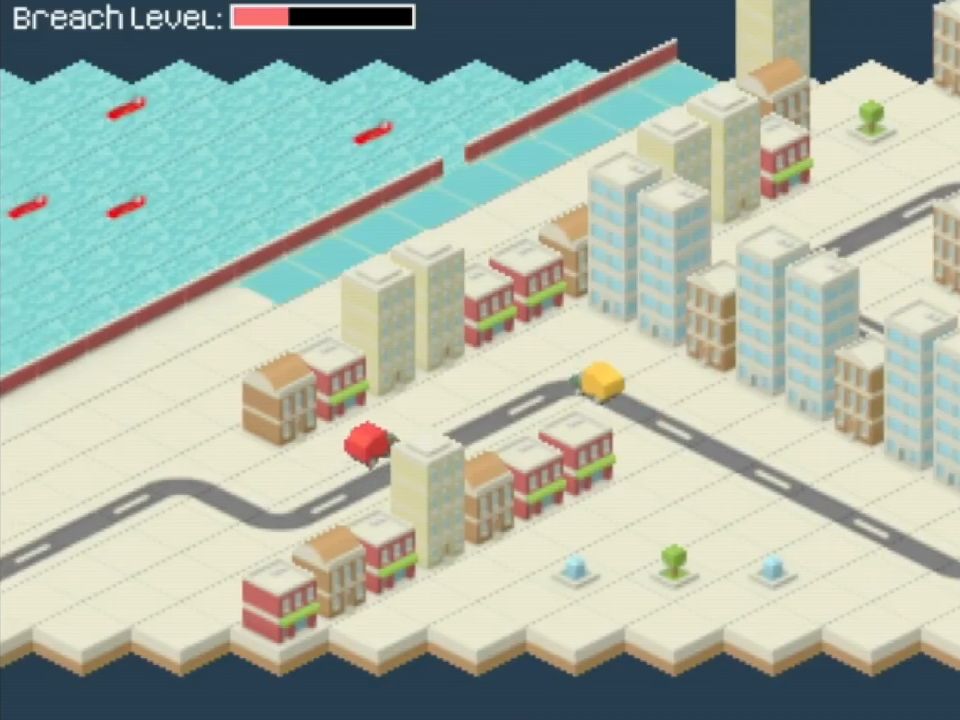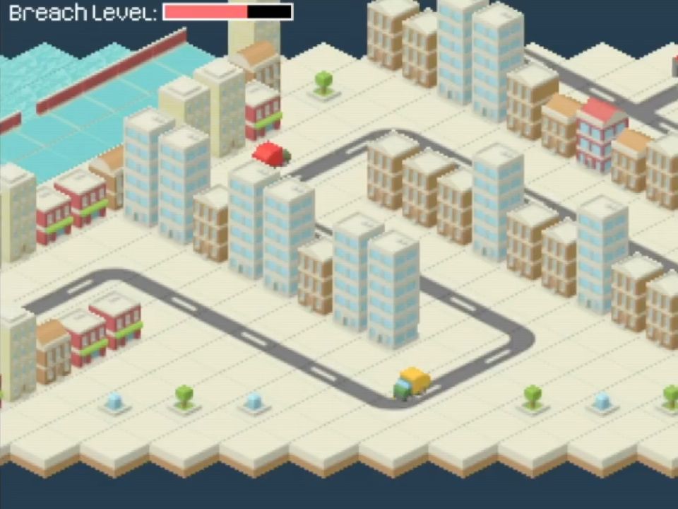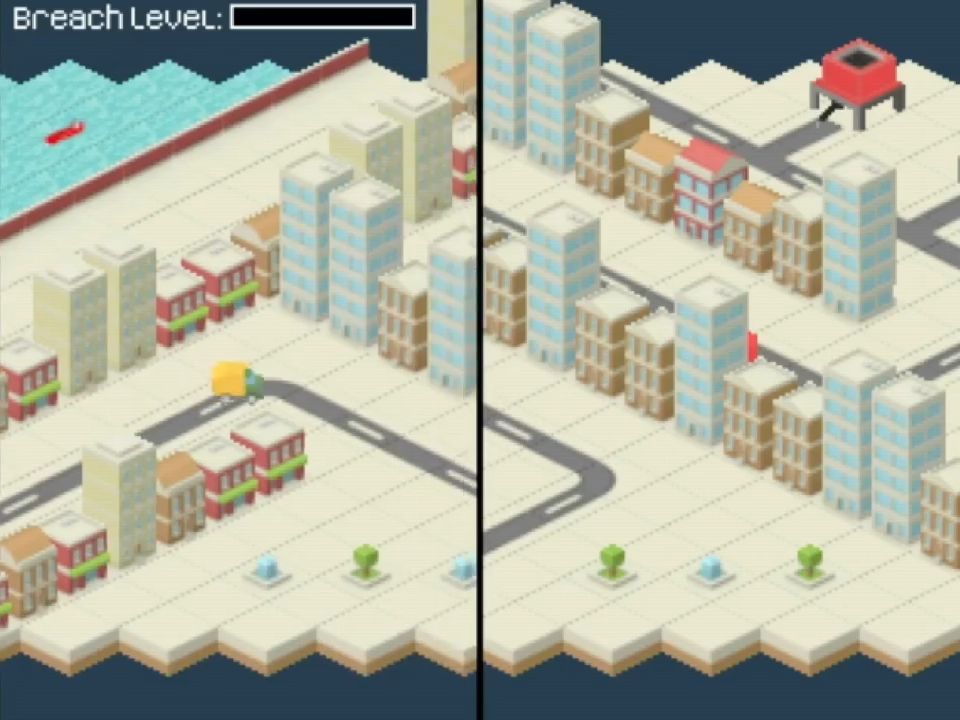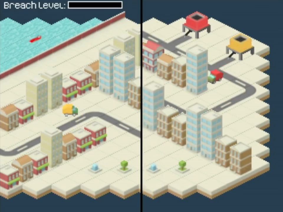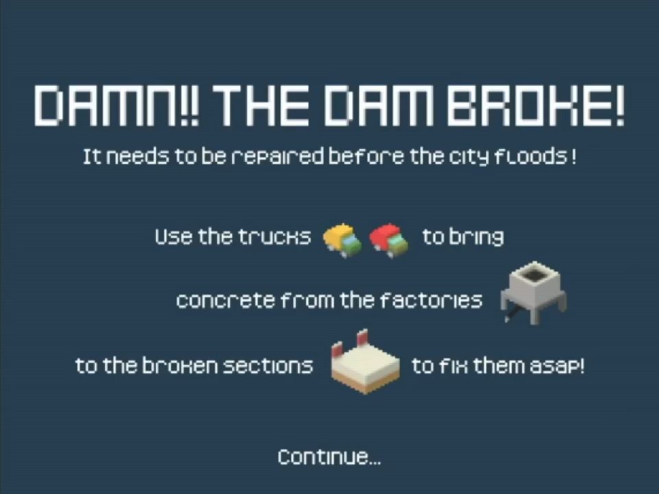 The premise of this game is fairly simple. The dam protecting the city is falling apart, and it’s up to you (and a friend) to plug up the holes with concrete. The problem is – the concrete factory is on the other side of town and you’ll have to ferry it over non-stop.