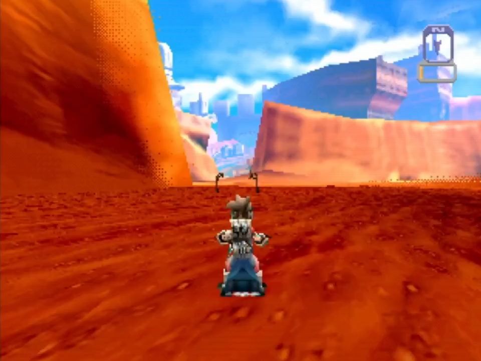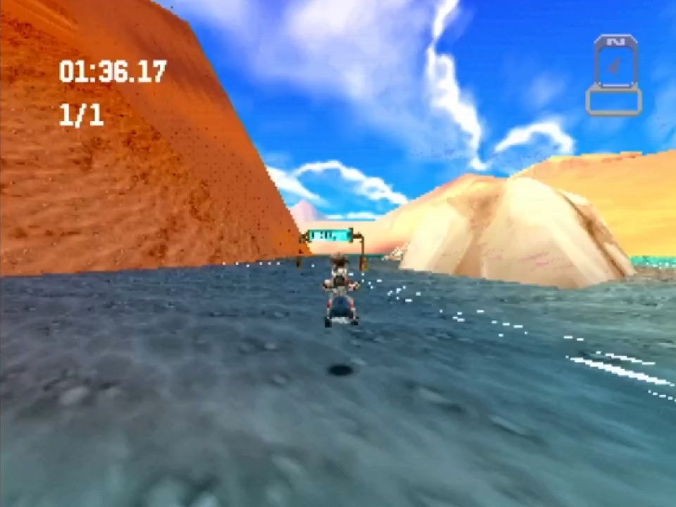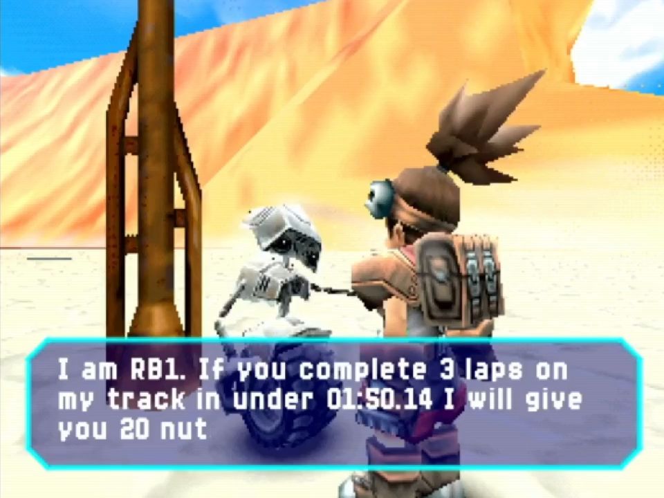 Scattered across the courses are racetracks lined with checkpoint gates, where victory demands one to three full laps. Only one holds a vital piece for the final repair; the others offer a modest reward of 20 nuts.