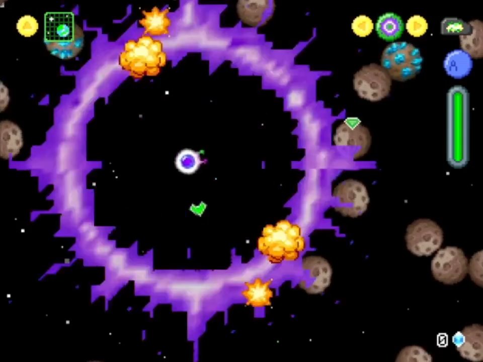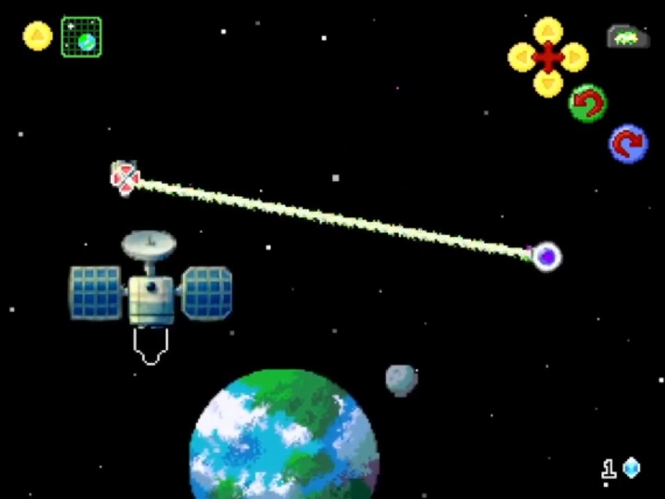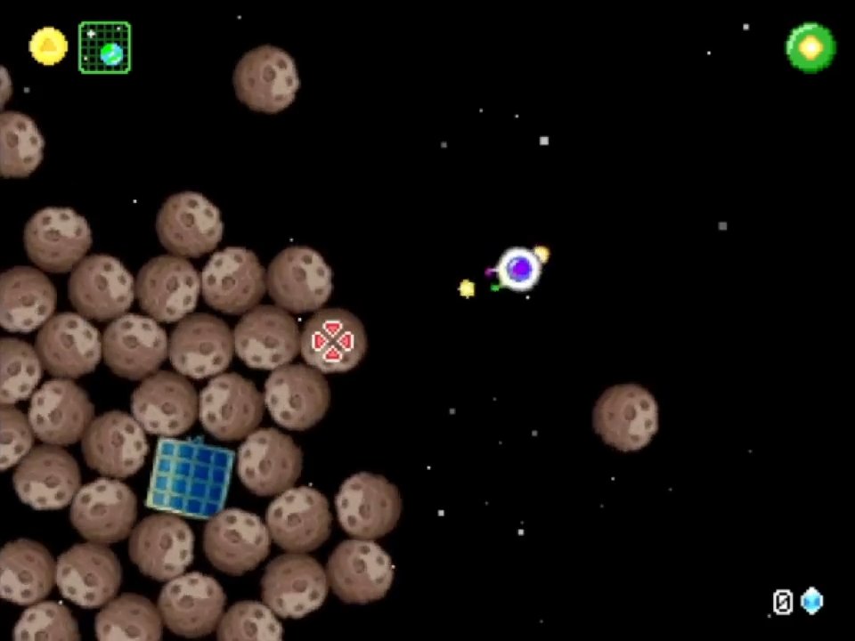 The main section of the game is a top-down all-directional space shooter exploration game like Escape Velocity (or Space Battle, if I might be so bold). There are various space objects like Terra (earth), Crankhorn’s station, and a variety of other planets. There are also object in space like asteroids and your missing satellite pieces.
